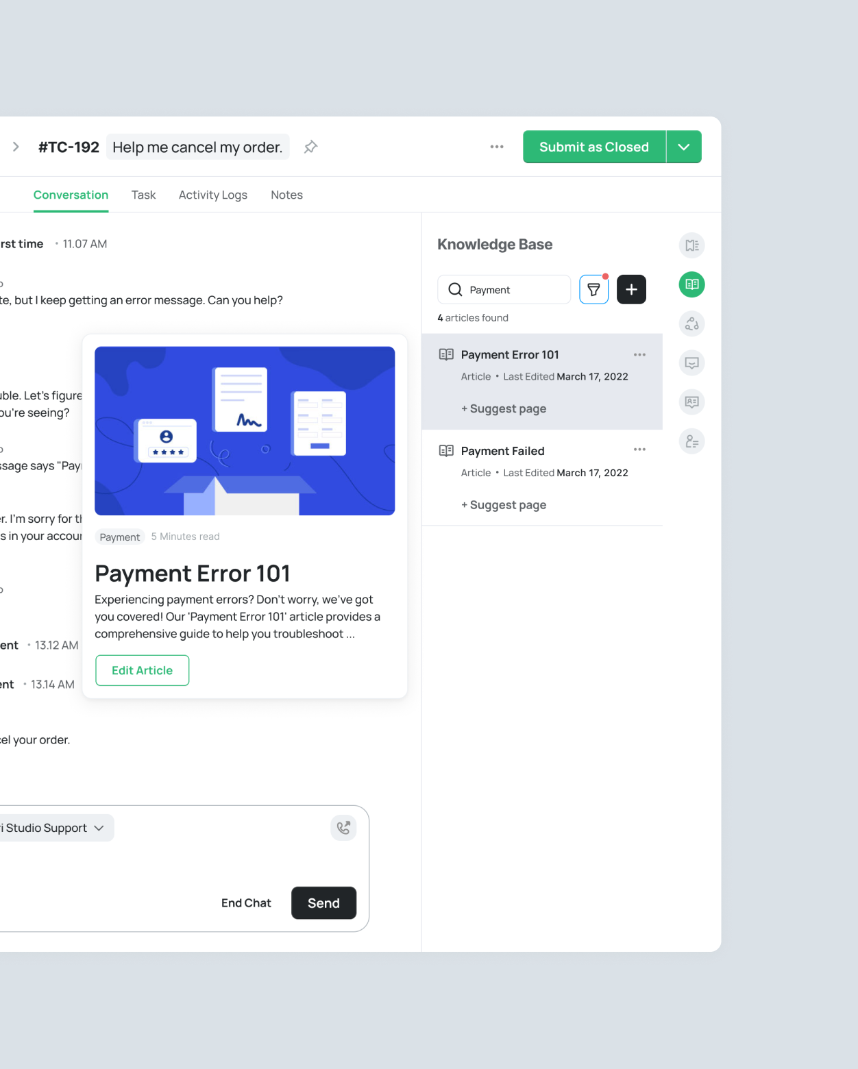 To establish a structured system in helping client needs more efficiently, Kirridesk is designed to address gaps or issues within customer service agents. In terms of features, Kirridesk adds elements that address common challenges among customer service professionals, such as knowledge base recommendations and responsiveness through the side conversation feature.